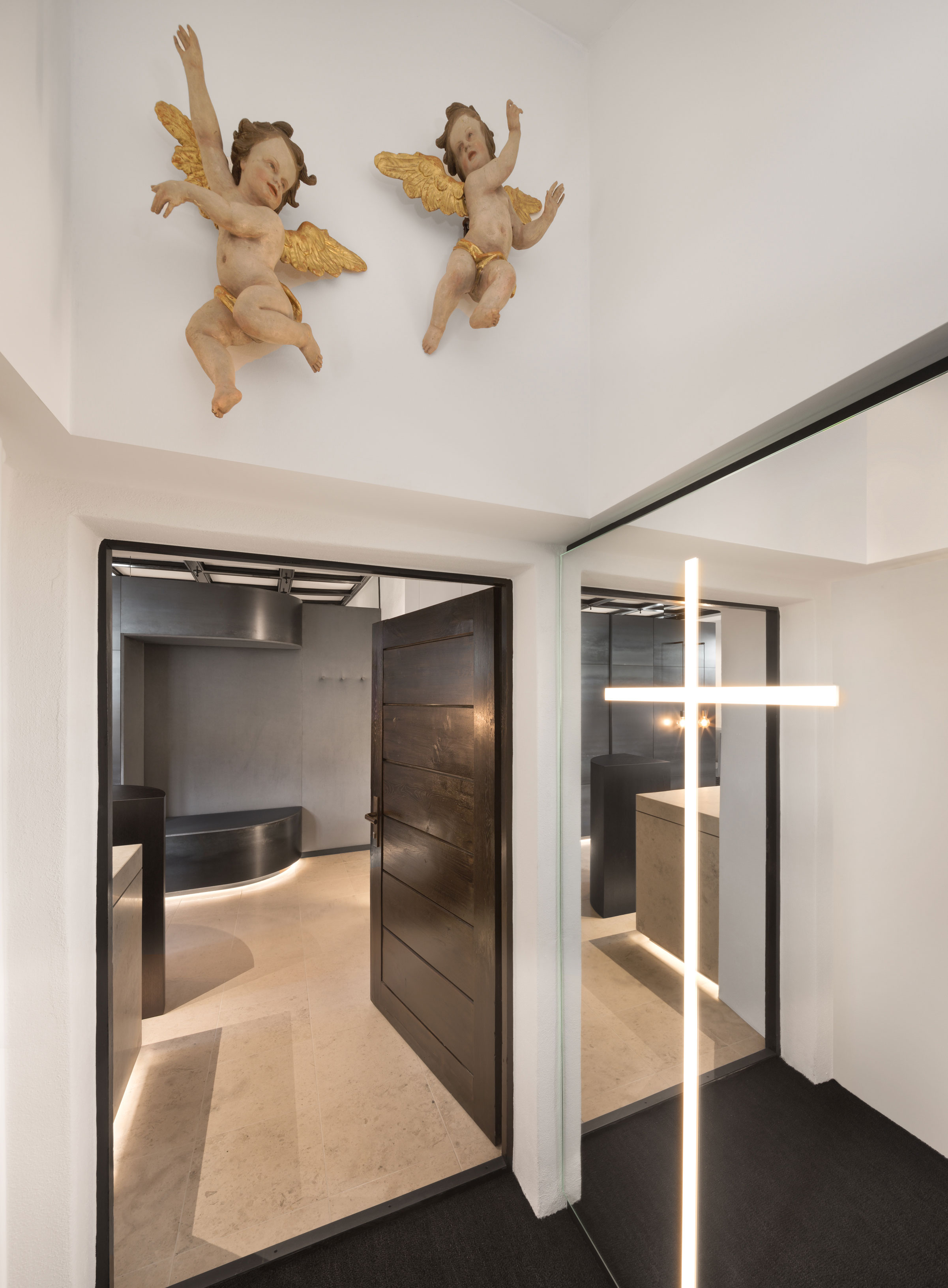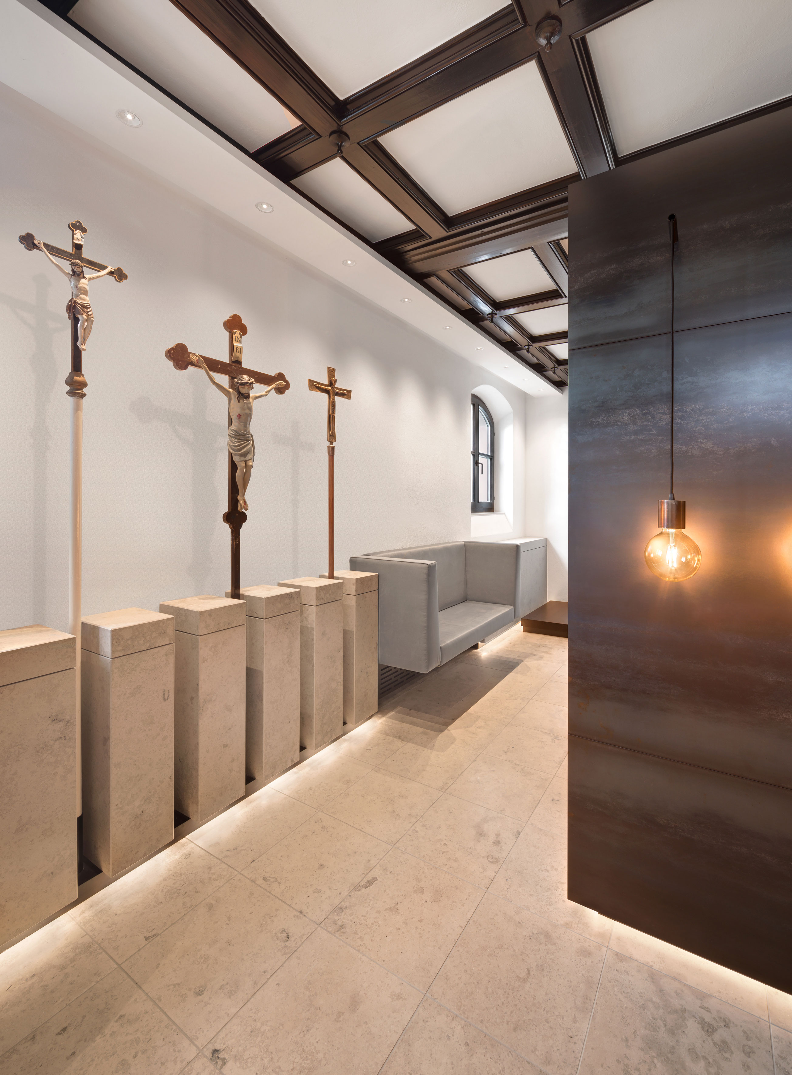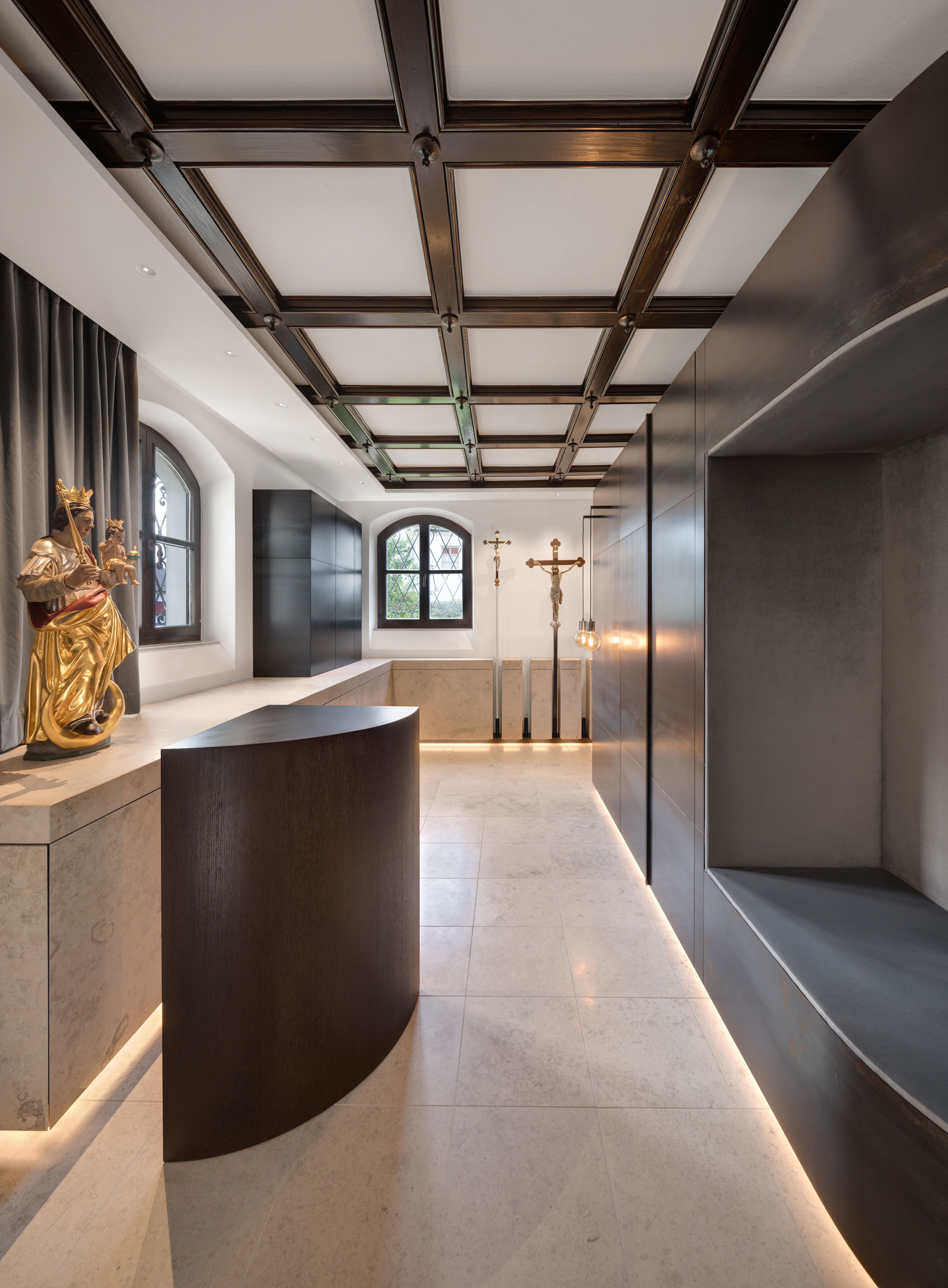 Die Sakristei der Pfarrkirche St. Ägidius mit einer Fläche von ca. 35 m² hat eine Vielzahl von Funktionen zu erfüllen, wie die Zonierung des Besucherbereiches beim Eingang, Zugang zum Ministrantenraum im OG, dezenter Einbau von technischen und infrastrukturellen Ausstattungen, sowie einer intimen Raumzone zur inneren Einkehr für den Herrn Pfarrer.