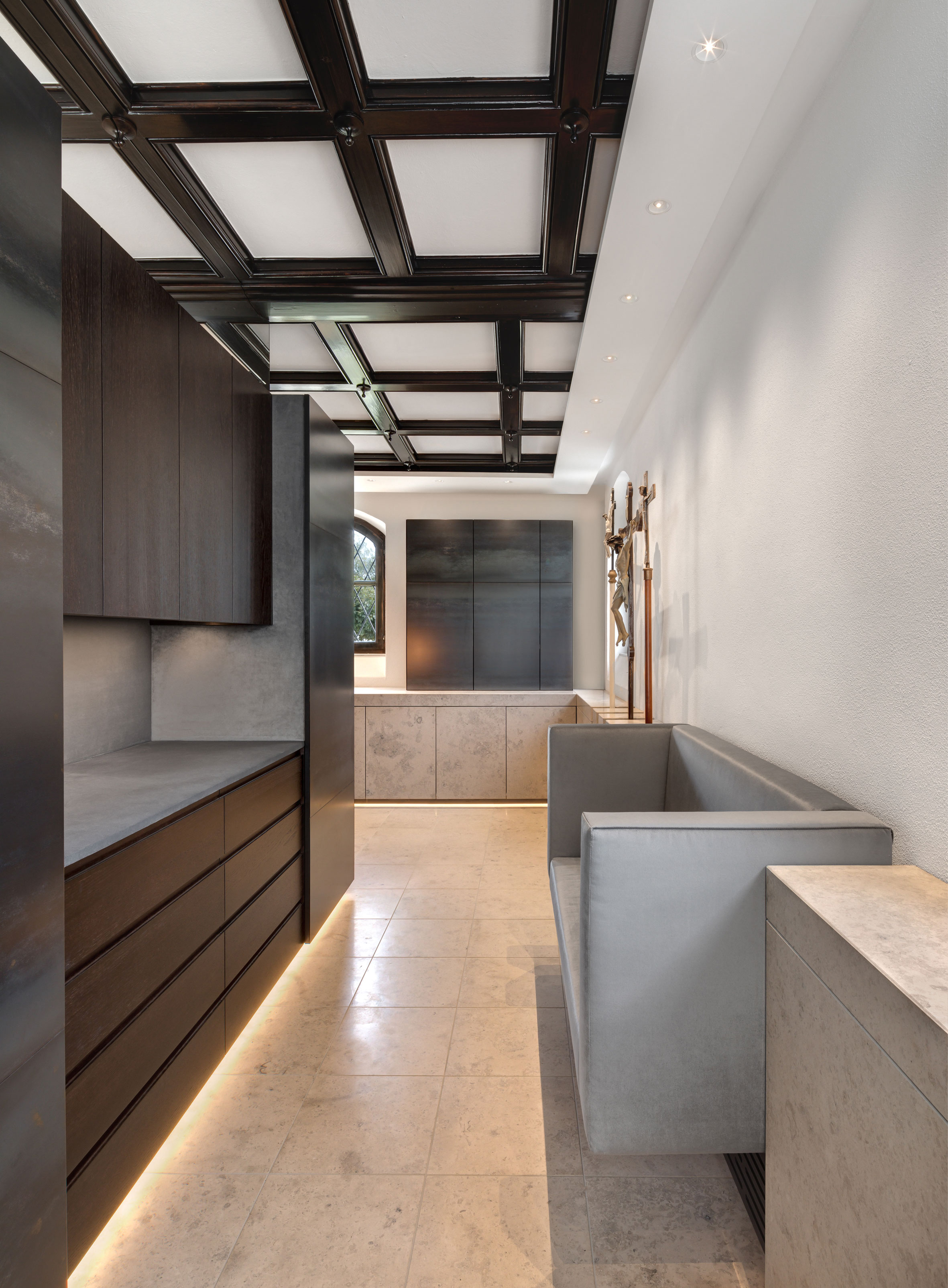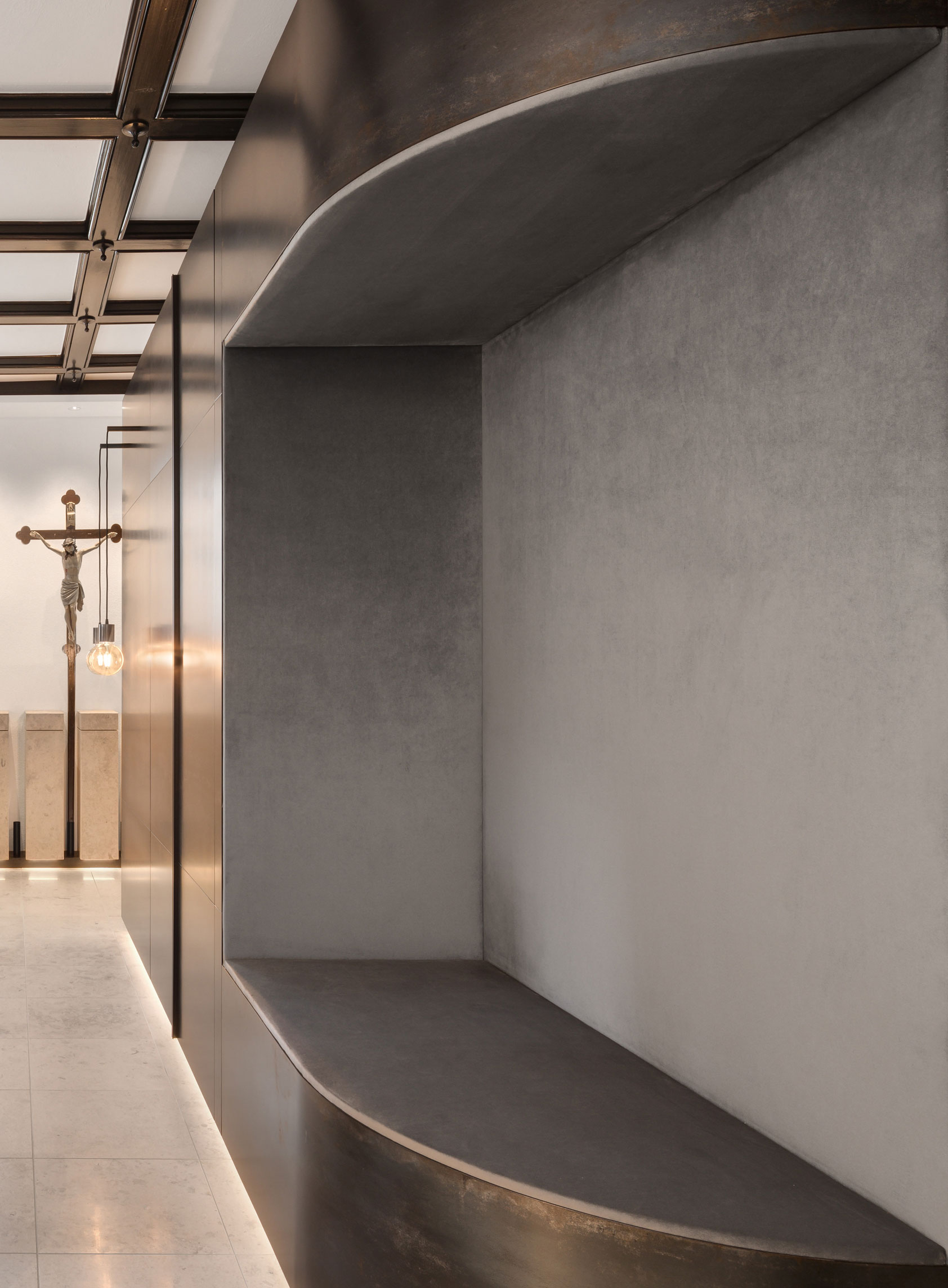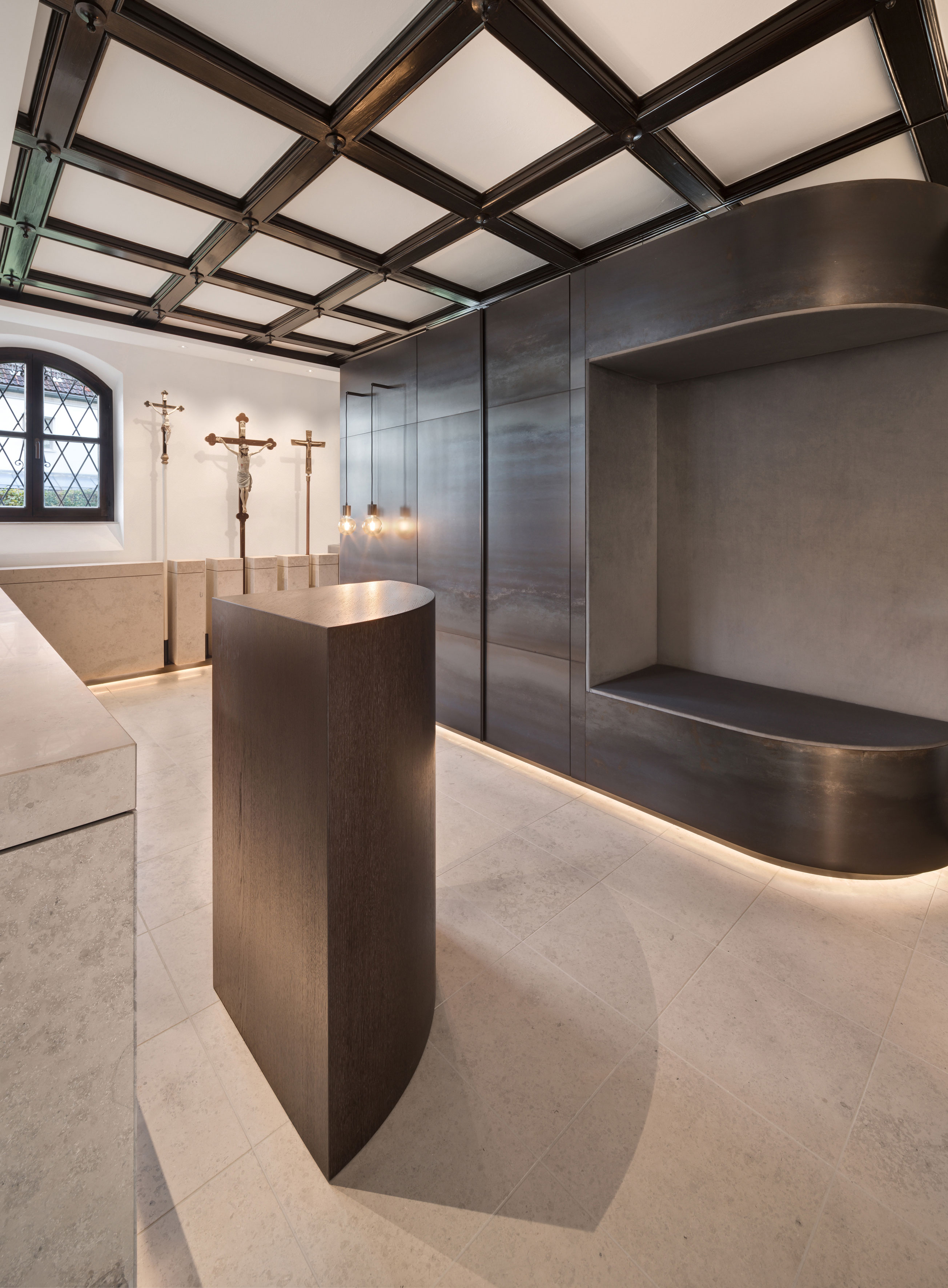 Die Sakristei der Pfarrkirche St. Ägidius mit einer Fläche von ca. 35 m² hat eine Vielzahl von Funktionen zu erfüllen, wie die Zonierung des Besucherbereiches beim Eingang, Zugang zum Ministrantenraum im OG, dezenter Einbau von technischen und infrastrukturellen Ausstattungen, sowie einer intimen Raumzone zur inneren Einkehr für den Herrn Pfarrer.